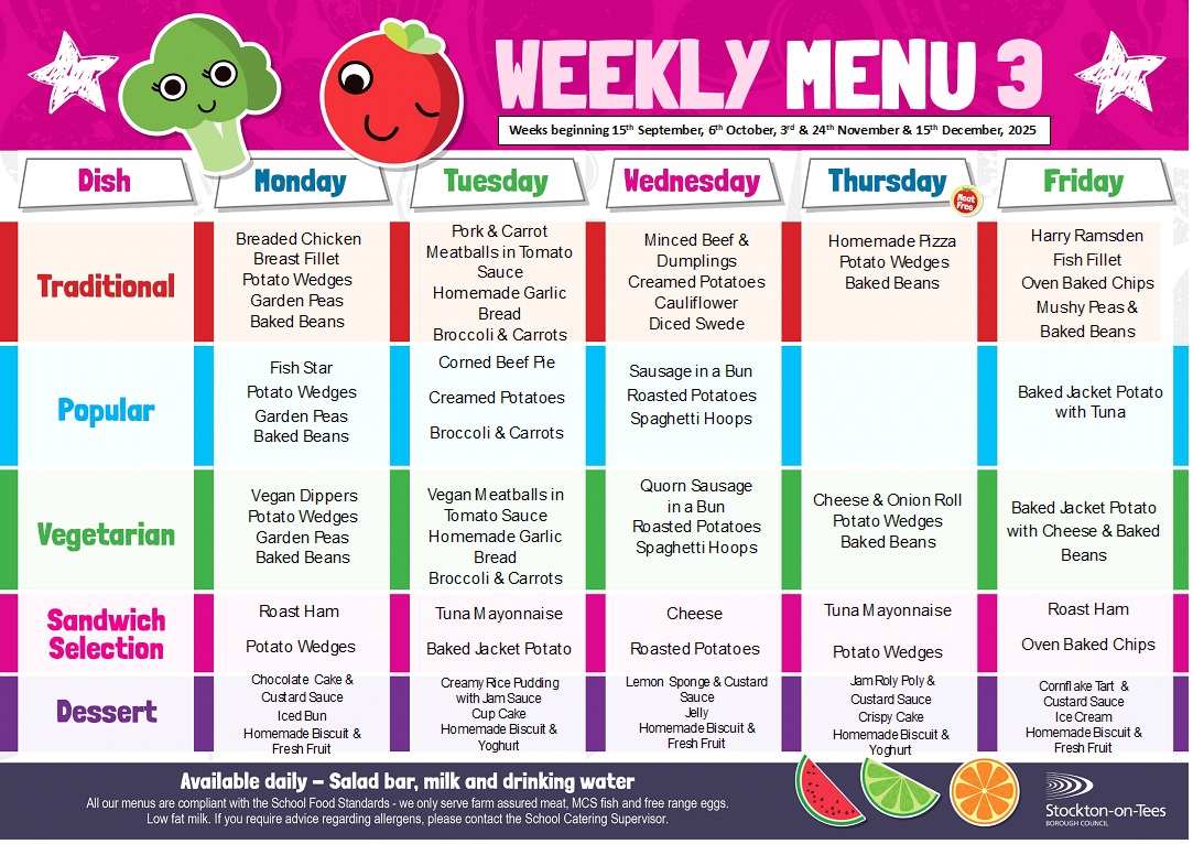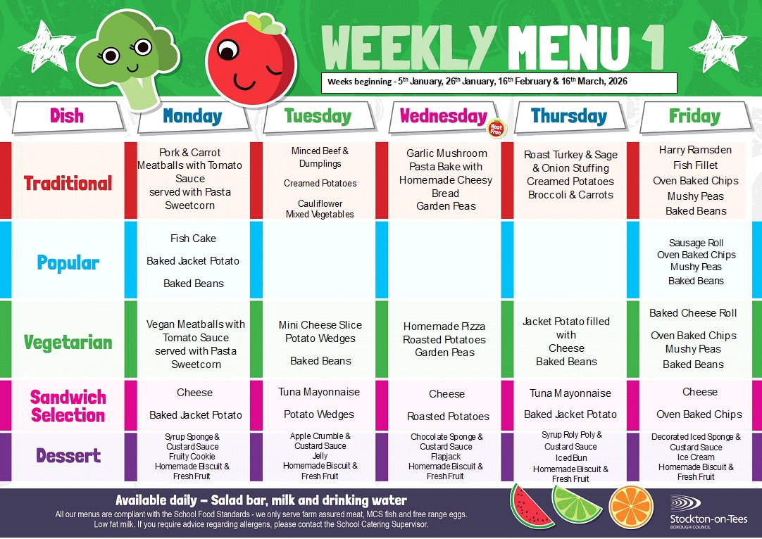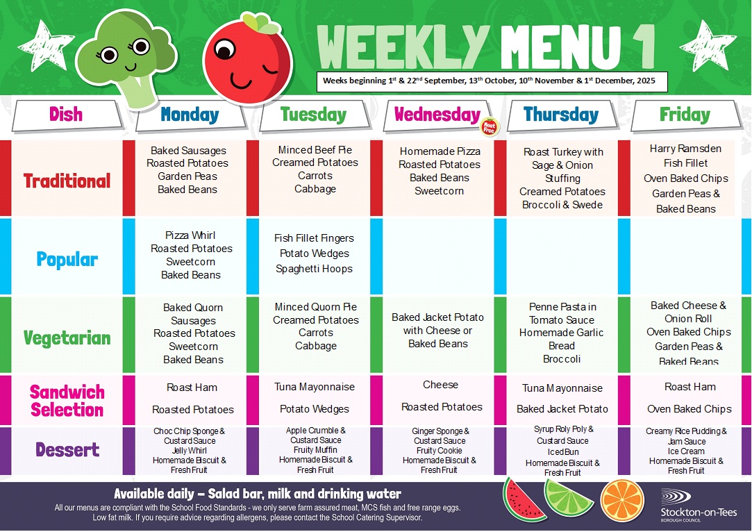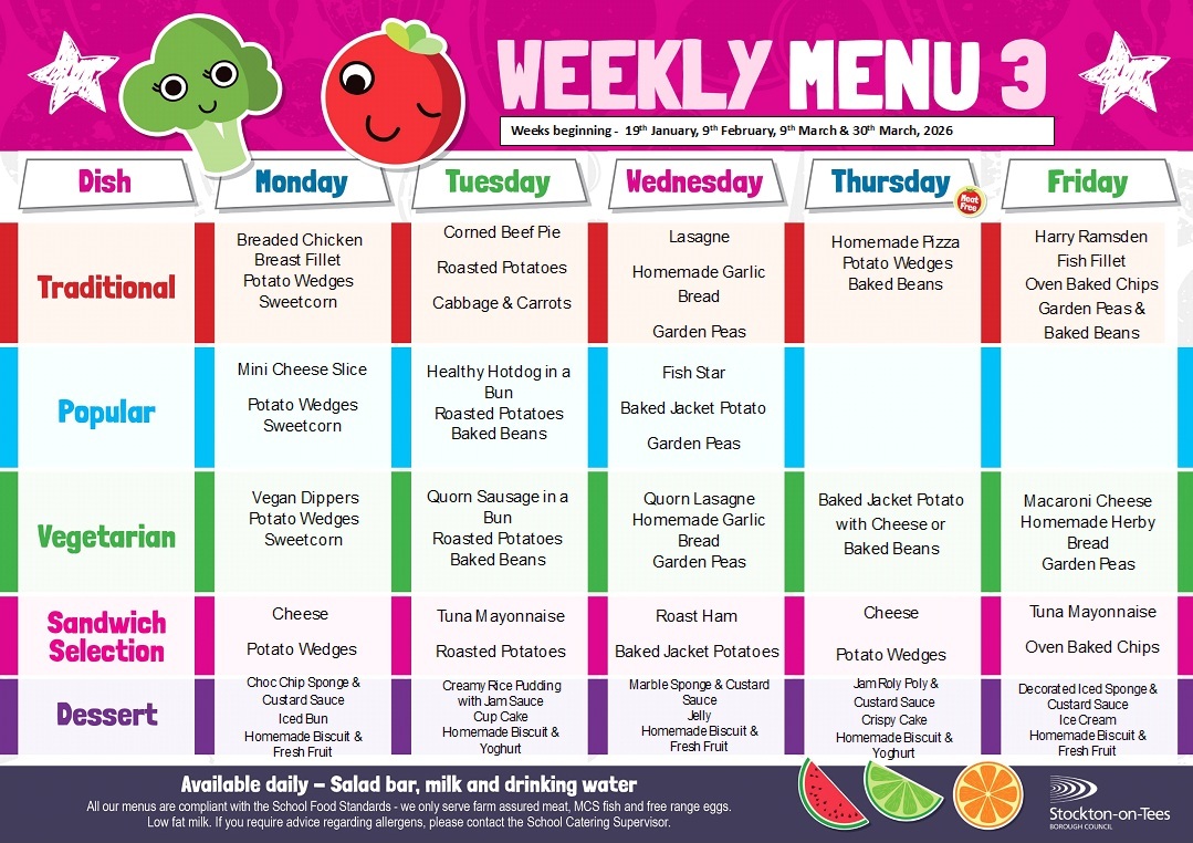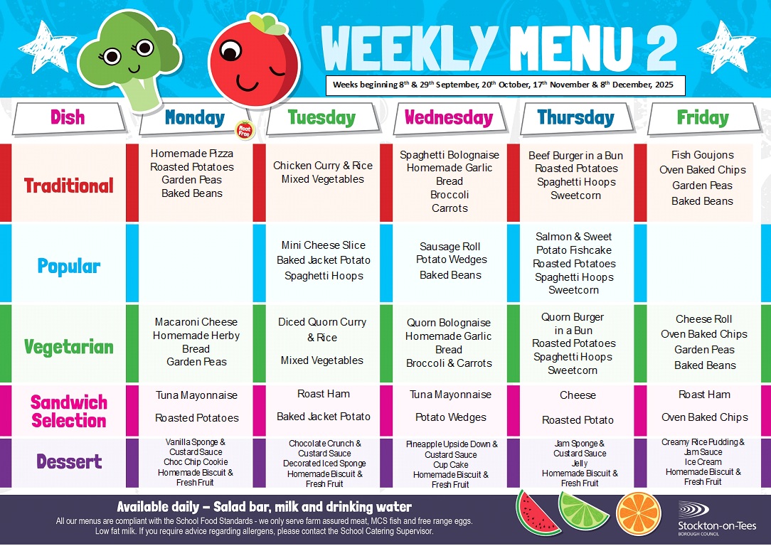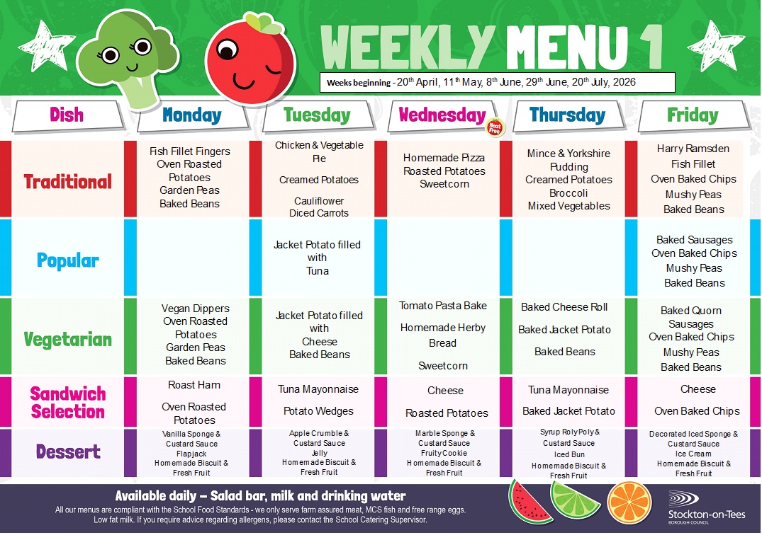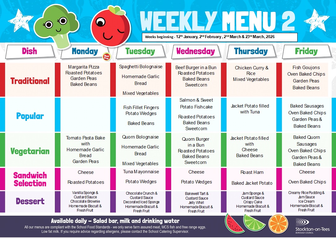 Our School Lunch Provider is Stockton Borough Council, lunches are booked daily and a wide selection is available, including salad and three dessert selections per day! A menu is sent out to each child and we ask that you discuss with him/her what they would like to eat. If there are any special dietary requirements, then please advise the school in writing.