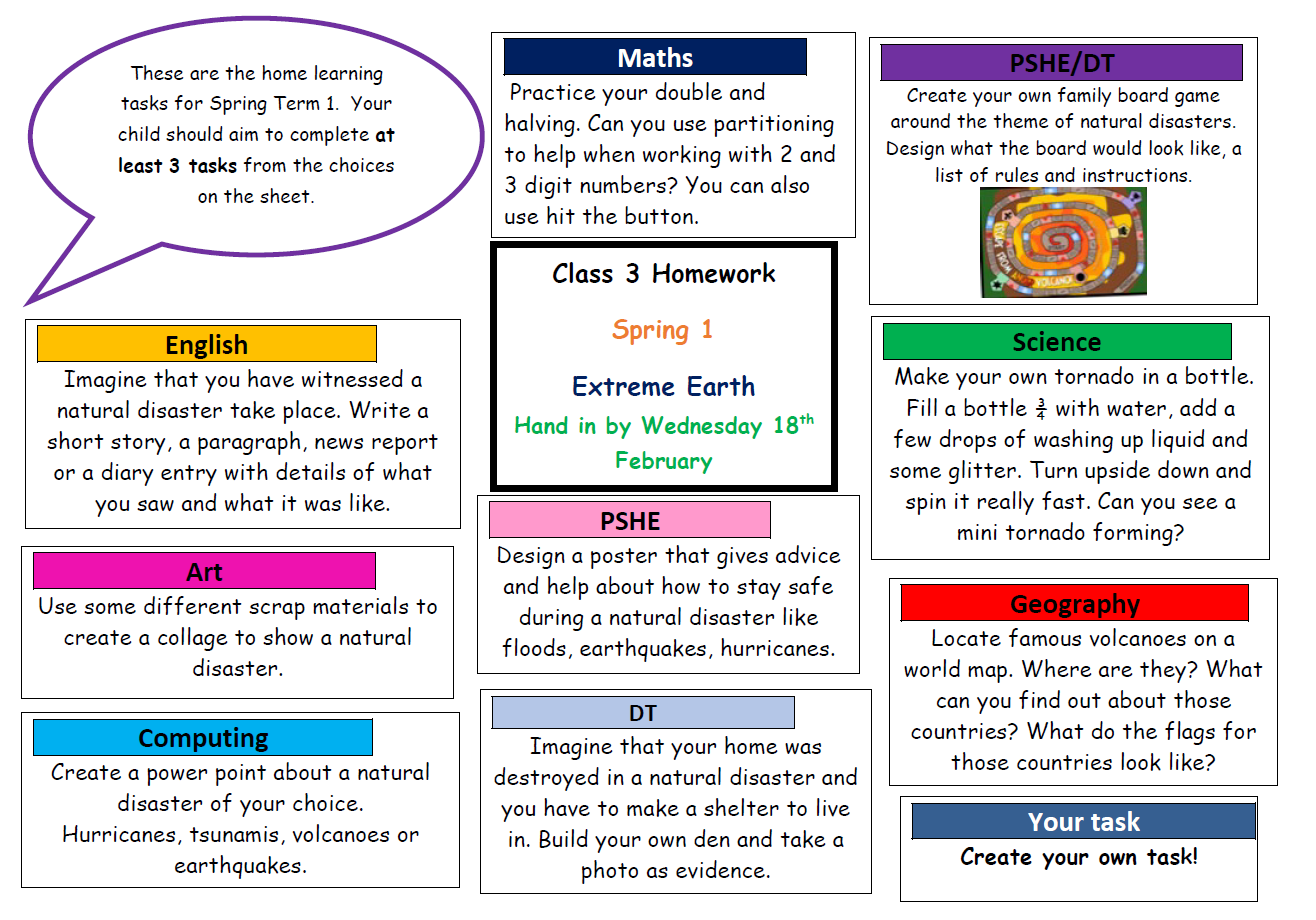 This term, Class 3 will be learning about Extreme Earth. Take a look at the Topic Homework for Spring 2. Click on the picture below: