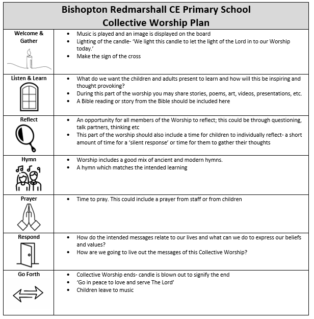 Collective worship is the unique heartbeat of a Church school and is offered as part of a wider opportunity for pupils and adults to encounter faith by engaging in conversations about God, both as individuals and together. Worship is an integral part of life at Bishopton and is a time when we want all pupils and staff to flourish and to understand that they are special in God's eyes. According to SIAMS (2023), 'Collective worship lies at the heart of each day and is a joyous expression of the Christian vision. This ensures that all are nourished spiritually'.